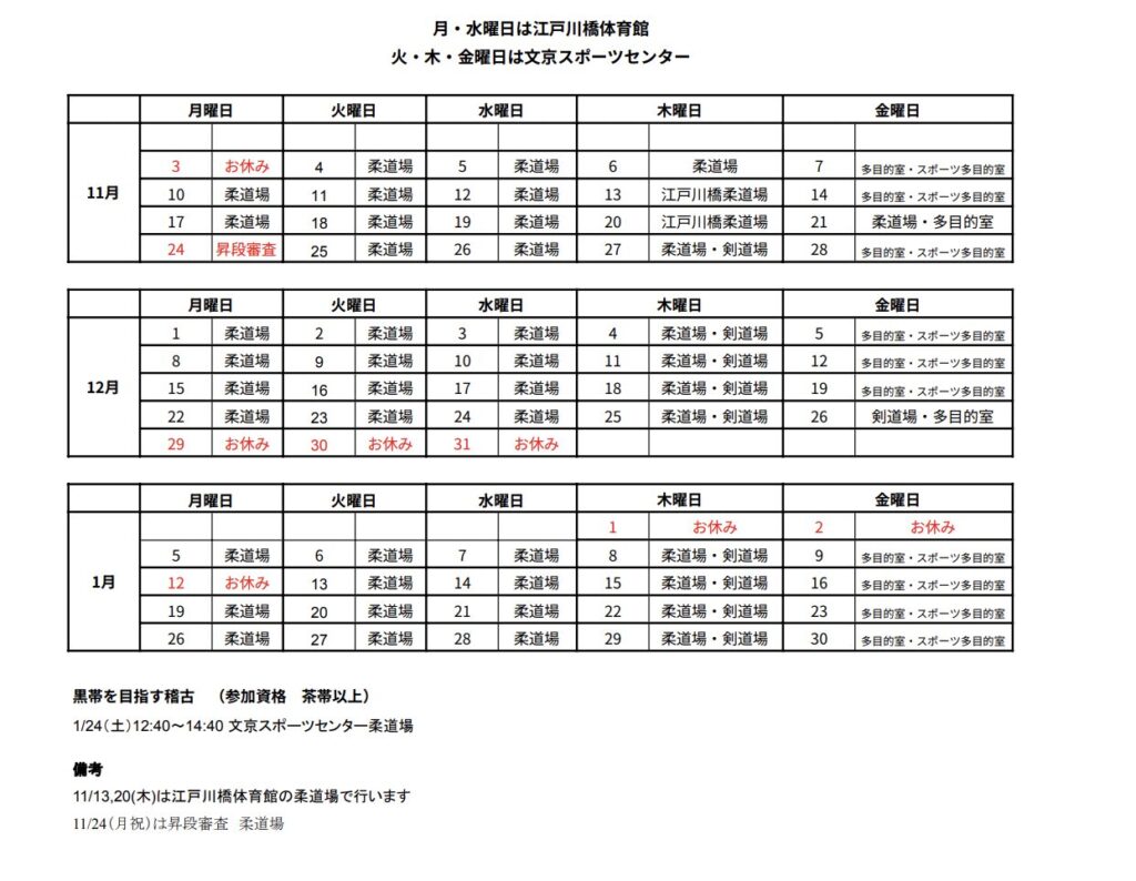 稽古場所 予定表 2024年1月19日 最終更新日時 : 2025年11月1日 Kodomohero稽古場所は添付画像をご確認ください。文京スポーツセンター・江戸川橋体育館、入口右手のホワイトボードに記入してありますので都度ご確認ください。