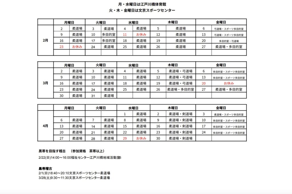 稽古場所 予定表 2024年1月19日 最終更新日時 : 2026年2月1日 Kodomohero稽古場所は添付画像をご確認ください。文京スポーツセンター・江戸川橋体育館、入口右手のホワイトボードに記入してありますので都度ご確認ください。
